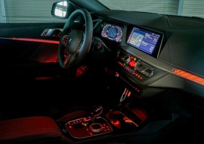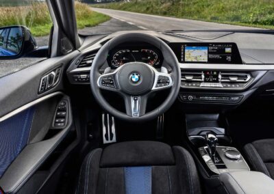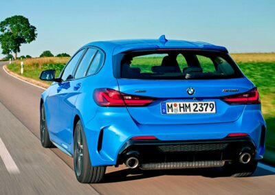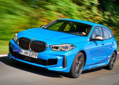 A real head-turner: the sporty and progressive design of the new BMW M135i xDrive could almost have been created to attract admiring glances in record time. The extremely distinctive front with large air inlets, prominent double kidney grille in mesh design and sloping Adaptive LED headlights ensures a memorable first impression.